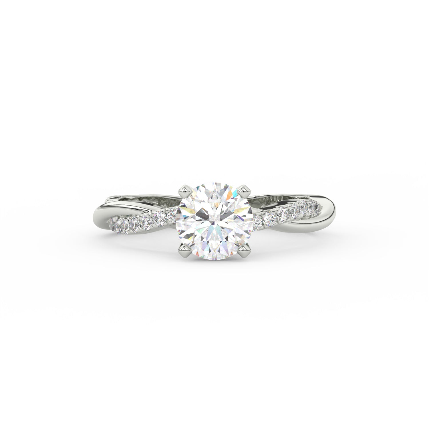 The twist solitaire setting adds a unique and graceful touch, symbolizing the intertwined journey of love. The rose gold band enhances the ring’s warm and romantic appeal, while the diamond half eternity accents along the band bring an extra layer of brilliance and sophistication.